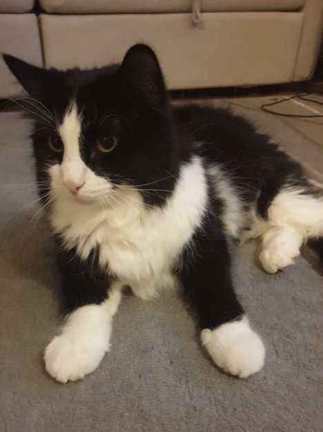 Karsten er sort og hvit langhåret og alle 4 ben/ poter er hvite.