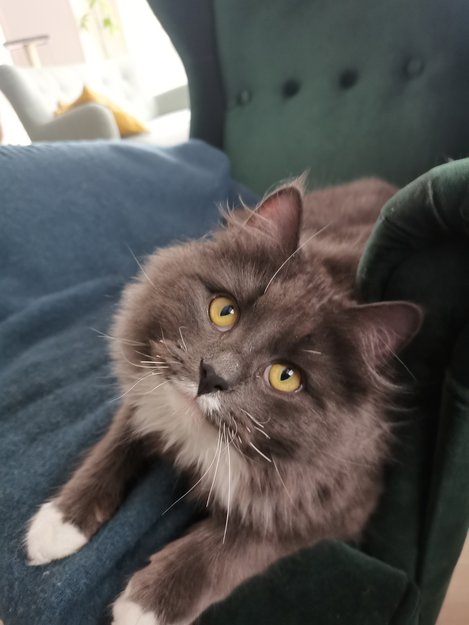 Veldig kosen og glad i folk, han har mange korte værhår. Hvite tupper på bena og hvit flekk i bryste.