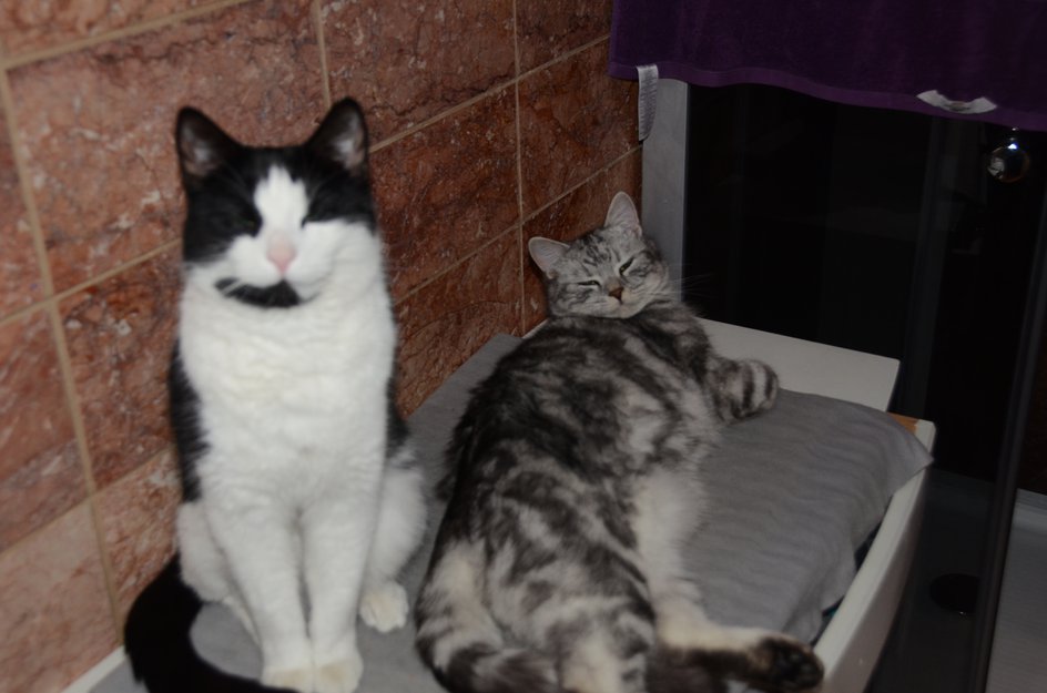 Salha tilhører naboen, Jesper er vår egen - begge er chippet og gode venner, går ut og inn gjennom vår kattedør (kun for dem).
