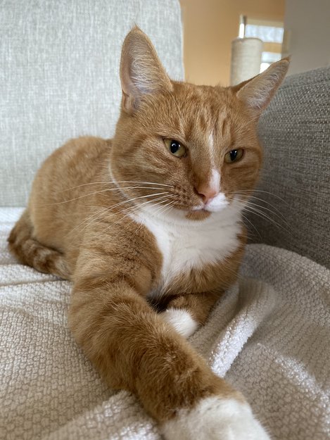 Oransje i pelsen med hvite sokker og partier på magen. Hun er chippet og sterilisert.
