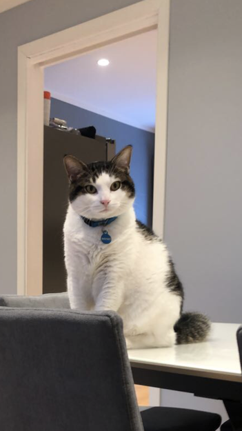 Han er korthåret, hvit, grå og brun. Han har tigermønster. Han bærer også på et lys grønn halsbånd med navnet sitt og telefon til eier. Han er 2 år gammel, men er en stor katt. Han kan være noe folkesky
