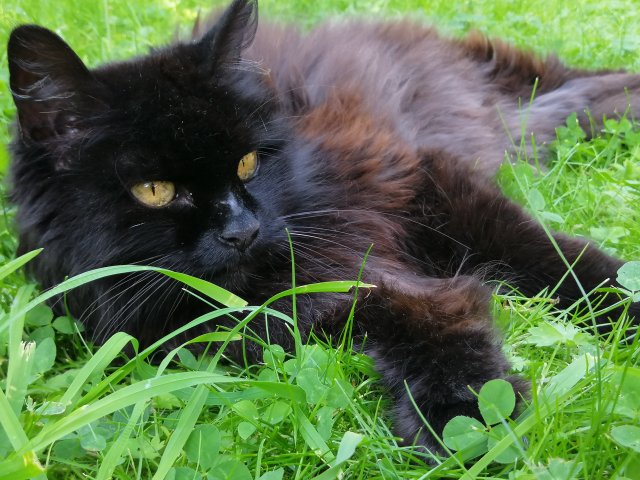 16 år gammel hunkatt. Lyder navnet Tasseline. Sort lang pels, hakk i ett øre, ett hvitt synlig værhår på høyre side av snuta.