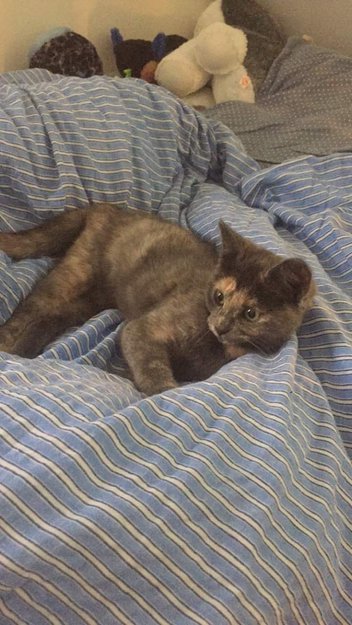 Kattungen ble funnet utenfor huset vårt etter å ha hørt den mjaue på morgenkvisten. Ungene forteller også at de har sett den på skoleområdet deres tidligere.