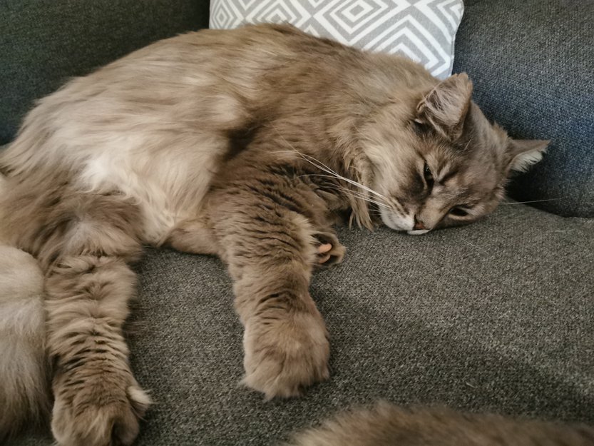 Lysegrå med noe hvitt. Stor langhåret hannkatt. Høyre øre er litt delt på tuppen etter gammel skade