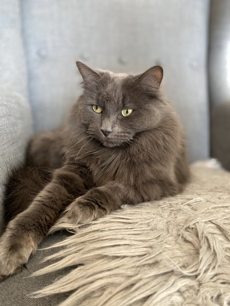 6 år, ikke så veldig stor, litt sky men tillitsfull. Mjauer lite/ svakt.