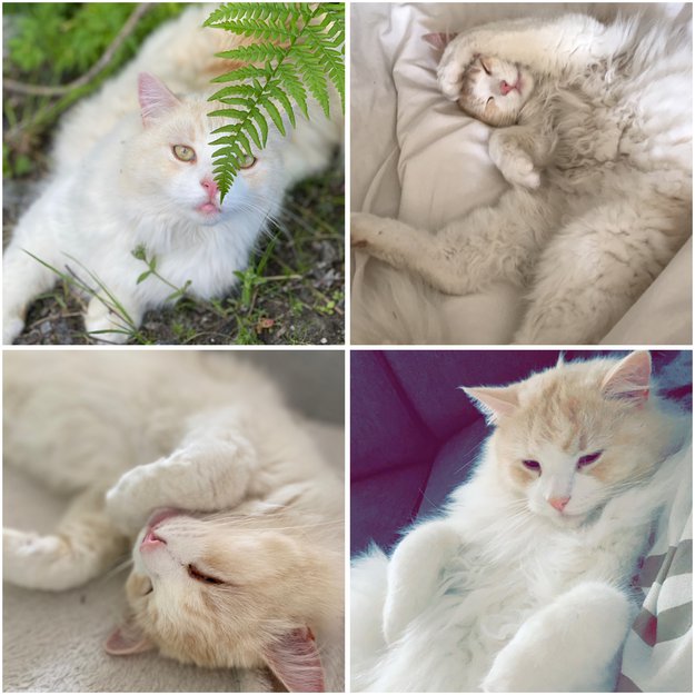 Middels langhåret, lys pels. Grønne øyne. Glad i kos, spesielt på magen. Nysjerring og uredd.