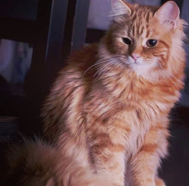 Oransje, langhåret hannkatt. Noe stripet, men i oransje nyanser. Hvit på hake og bryst. Skvetten og litt redd, som om han er litt på vakt. Veldig kosete, men det er med oss som kjenner han godt. Mulig han kommer bort til ukjente, men da må man sette seg ned og lokke han til seg med rolig stemme. Han er chippet, men jeg har ikke chipnr. tilgjengelig.