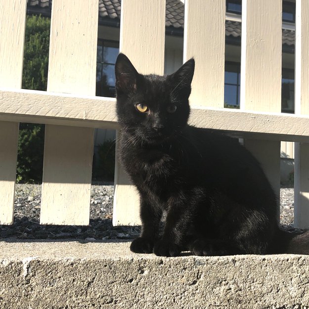 svart hannkatt, mjauer endel og er veldig glad i andre katter