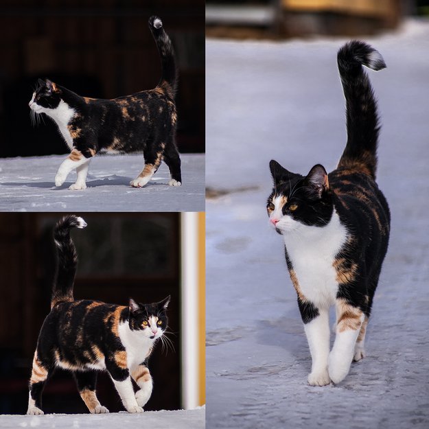 - Tricolor pels - mest svart, kvit på undersida og flekkar av raude og oransje striper.