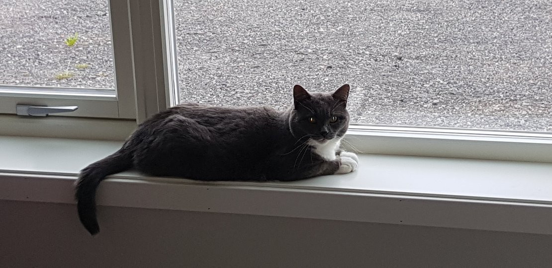 2 år gammel hunkatt. Hovedfarge grå, hvite labber og bryst, lange hvite værhår. Er veldig var av seg.