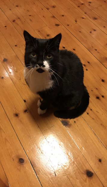 Jonas er svart og hvit korthåra. Han er hvit på beina og er hvit på brystet. Han er litt hvit over munnen, med to svarte prikker i det hvite. Han er veldig kjelen og går bort til hvem som helst