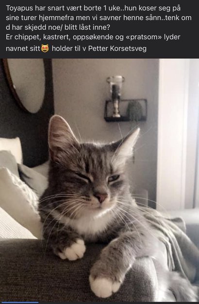 Toyapus har katteluke og kommer å går som hun ønsker. Alltid en tur innom opptil flere ganger om dagen..men ikke nå..