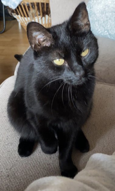 Ho er helt sort, med 1-2 hvite hårstrå på hodet og det samme på brystet. Ho har noen småarr på ørene.