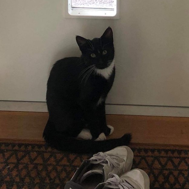 Hugo er sort med hvite poter. Han er hvit under haken å har ett hvit mønster på magen. Han har ett lite hvit mønster mellom øynene.