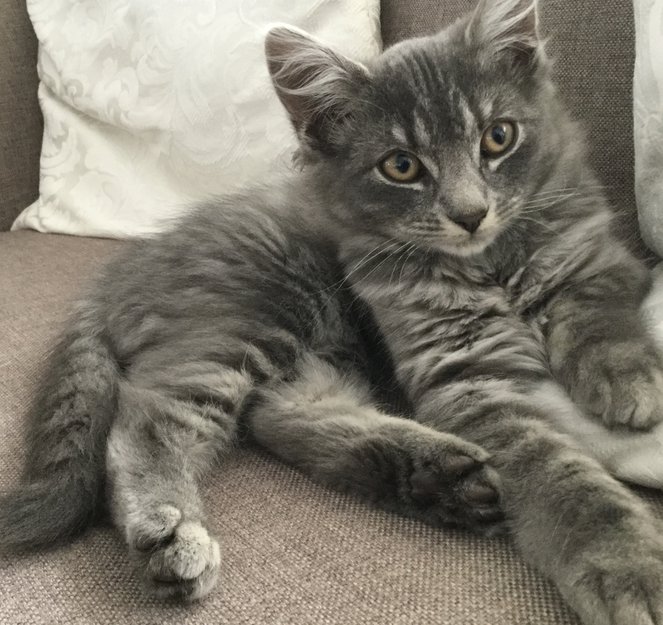 Une er ca. 5 mnd. Om en kjenner etter har hun en knekk ytterst på halen og en rift i venstre øre.