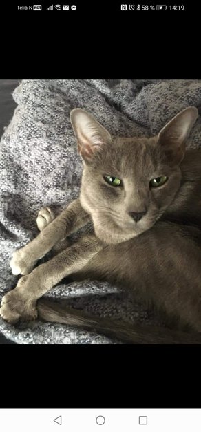 Hun er Russian Blue på 2 1/2 år og har kort sølvgrå pels.