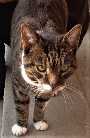 Han er stripet makrell-mønstret og har spesiell hvit trekant på venstre labben, hvit på brystet og under magen, hvite sokker på labbene. Han har rimelig fettete pels, som også gjorde det mistenkelig om han har et hjem.
