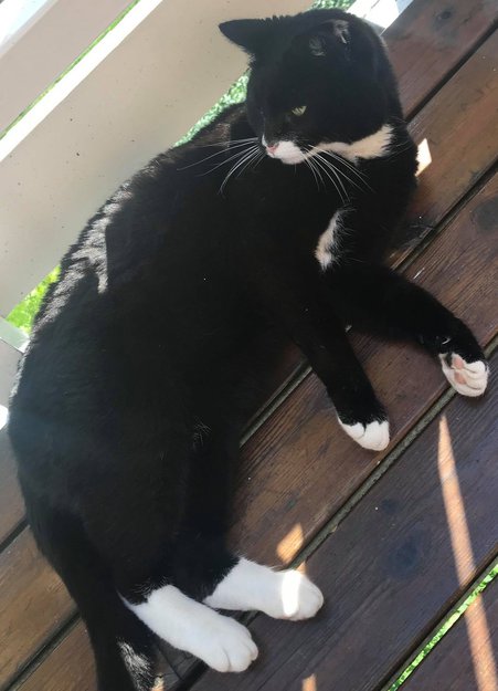 Sort katt med hvite poter, hvit rundt nesen, hvit under halsen og litt hvit på brystet. Grønne øyne.