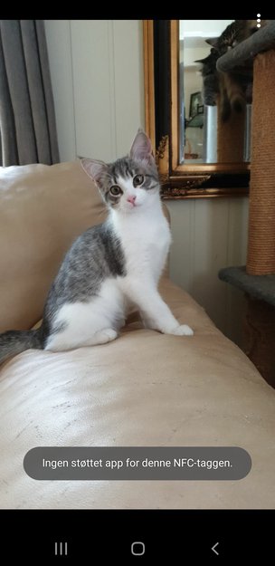 Er tigerstripet i det grå. Slank blanding av Bengal og huskatt. Hvit stripe nesten ytterst på halen.