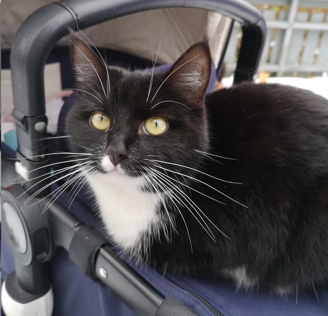 Svart katt, hvit på brystet og buken, hvite poter foran, hvite sokker på bakbeina (spesielt venstre).