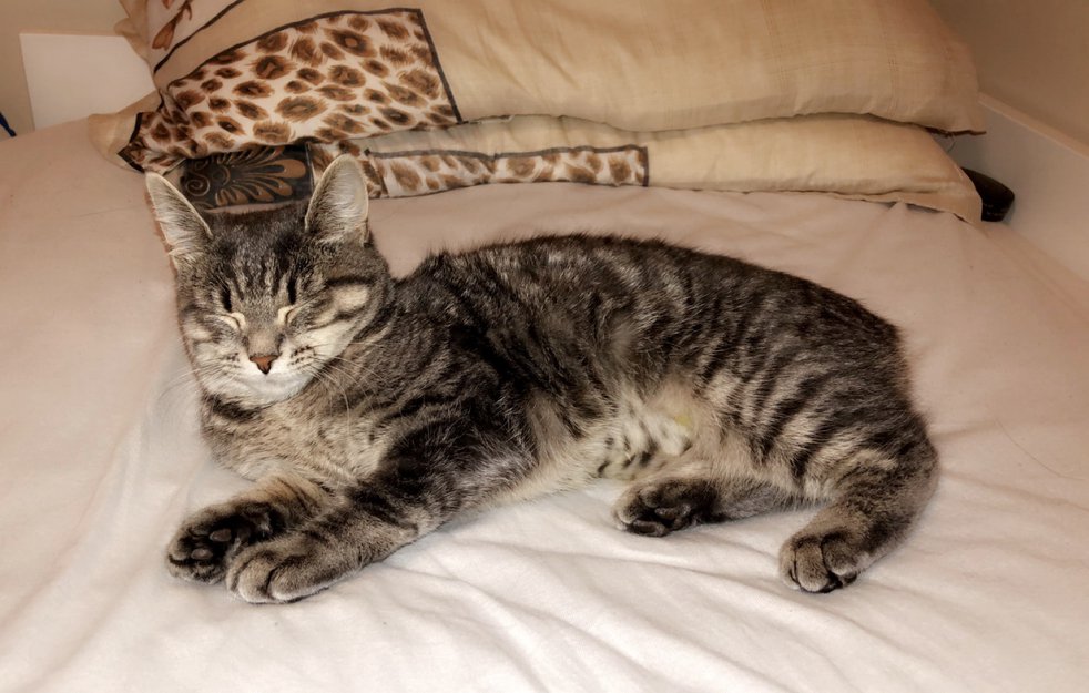Ris er grå og hvit stripet. Hun er ID chippet og sterilisert. Hun er veldig vennlig og mjauer en del. Hun er ganske liten og glad i mennesker.