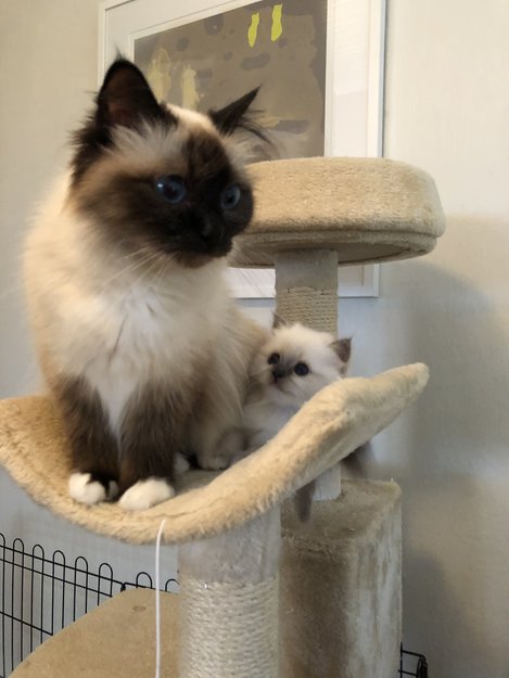 Katten er liten. Den har hvit pels med litt brunfarge i. Sort ansikt og sorte bein med hvite poter
