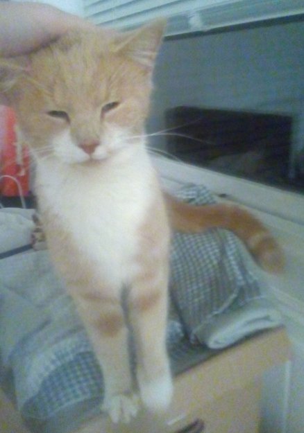 Rød stripete/mønstret pels med hvit krage, hvit under bryst og mage og hvite poter. Ikke chippet/øremerket eller kasterert da han ble funnet. Kattunge, ca.8-10 måneder. Veldig tillitsfull, kjælen og kosete etterhvert, også med min voksne hannkatt som godtok han med en gang. Han var veldig redd de første 2 dagene, og gjemte seg i de smaleste stedene han kunne finne, som under dusjkabinettet, og måtte lokkes frem.