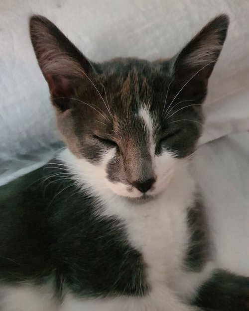 Liten hunnkatt, ca 2 kg. Har to prikker under nesa og grå flekk under haka.