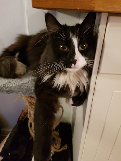 4 år gammel kastrert og chippet hannkatt. Lang pels, Svart/rosa snute. Hvit oppover nese og nedover hals og mage. Gul/oransje øyne. Er generelt litt skvetten av seg, og oppsøker sjelden folk. Lang bustete hale.