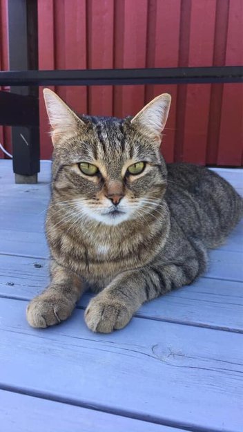 Brunstripete. Er hvit i området rundt munnen. Han er glad i folk og mjauer masse for å få oppmerksomhet. Han har også en tendens til å følge etter folk.