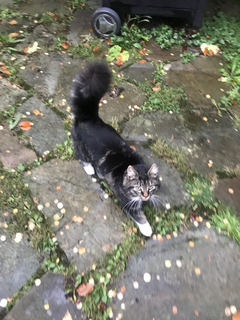 Katten fulgte oss hjem i 18-tiden 01.10, har holdt seg på trappen vår siden da.