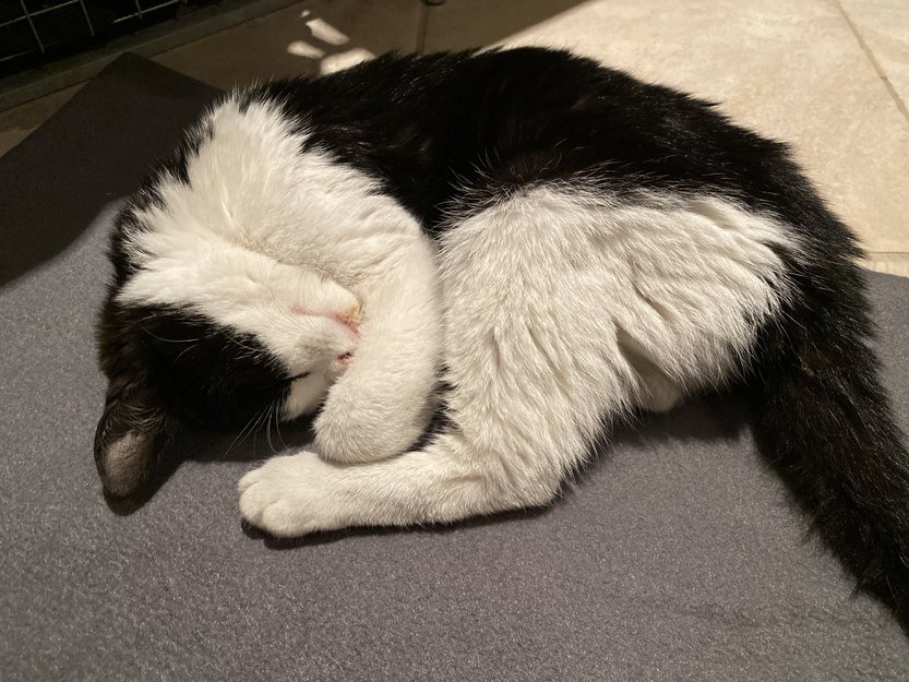 Liten svart og hvit kattunge ca 4 måneder var i gårdsplassen vår og gjemte seg i dag til morgenen og var fortsatt her i ettermiddag . Den går rart med bakbeinet så har vært hos dyrelegen men ikke funnet noe brukket den var dehydrert og svært sulten og er veldig stusselig og stille . Vi har tatt den inn på badet for natta og gitt den oppbløta mat og den ligger nå og sover .Vi håper eier tar kontakt snarlig på Tlfnr 90817472 da vi har astmatikere og katteallergikere I huset .