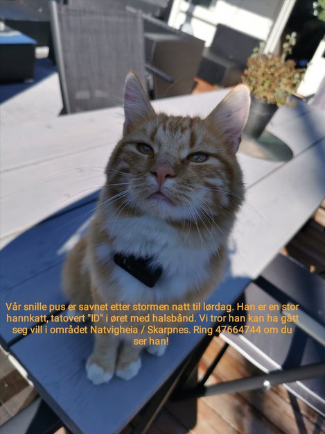 Pus forsvant etter stormen og har ikke kommet tilbake. Vi er redd noe har skjedd han siden det var storm. Pleier å komme inn til fast til hver kveld. Vi har lett i områder han oppholder seg i og banket på hos naboer, sjekker garasjer.