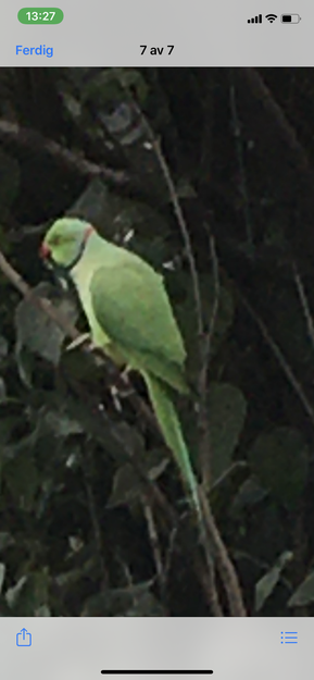 Grønn, rødt nebb, sort fjær i «ring» rundt halsen, 25-30 cm lang med lang stjert.