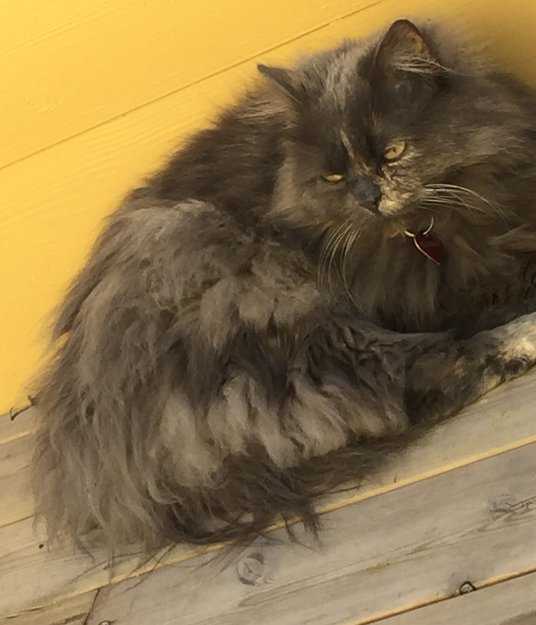 Hun har langhåret grå pels med enkelte sjateringer i hvit/lysegrå/gul. Hun er nå delvis klippet kortere over ryggen pga floker i pelsen.