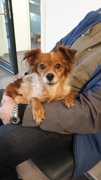 Hvit hund med brune flekker. Ligner på en Jack russel/papilon blanding