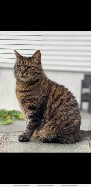 Veldig kosete og sosial pus på 10 år. Har hakk i det venstre øret.