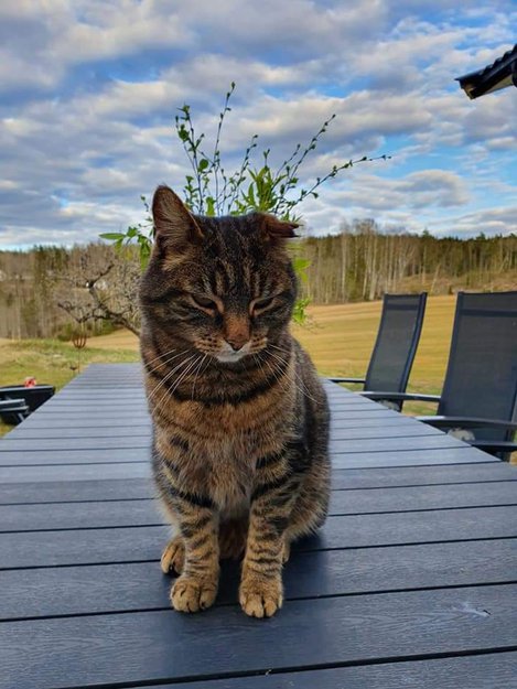 Mjauer en del. Svært kjelen. Krønsjet venstre øre etter tidligere slosskamp. Han er 8 år. Ca 5 kg. Lange bein.