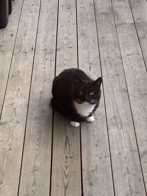 Denne nydelig pusen har holdt til utenfor huset vårt i Mokollveien, en stund. Den er veldig sky og løper unna så fort vi kommer i nærheten, men legger seg på verandaen her så fort den har muligheten.
