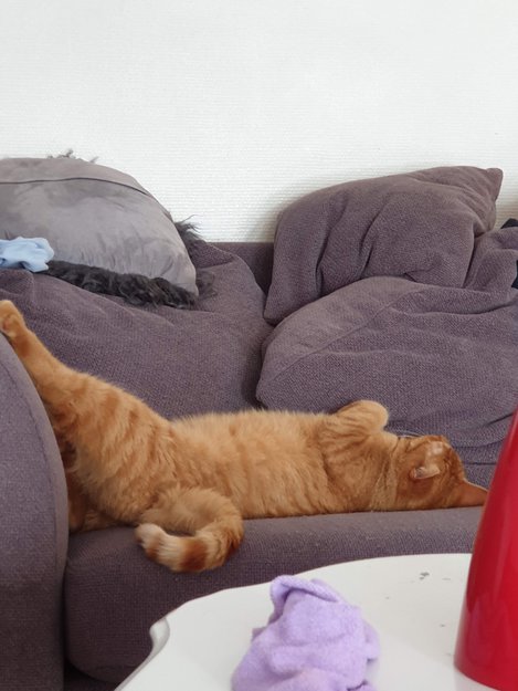 Orangebrun. Noe hvitt på brystet. Store poter. Snill og klok.