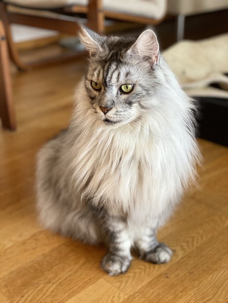 Tojo er en svartsølvtabby, og har lang, hvit manke. Tojo kan være redd for fremmede, og veldig redd for hunder. Han er en stor katt av rasen Mainecoon, og veier ca. 9 kg. Han er kastrert og chippet.