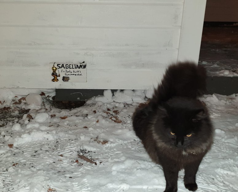 Sabeltann er ca 2 år gammel, kastrert, hvit flekk på brystet og et hvit hår i barten. Han er chip merket høyre side i nakken.