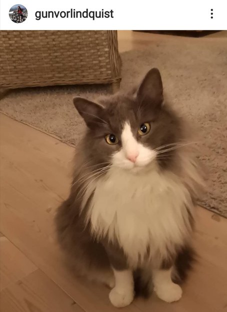 Grå(sort)/hvit. Hvite bein og bryst og på hvit ring på hale. Han er svært glad i mennesker og kontaktsøkende. Han ble hardt skadet for 4 år siden (påkjørt?), måtte opereres. Av den grunn er han engstelig for høye lyder og enkelte berøringer.