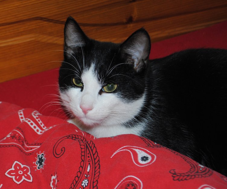 Slank, kosete, svart og hvit, drøyt ett år gammel. Ingen spesiell flekker eller kjennetegn. Uten halsbånd eller merking.