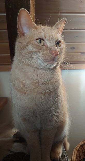 Lys rød farge, svake tigerstriper med litt mer markerte striper ytterst på halen. Sett fra siden har han bittelitt underbitt. Kan være sky, men er utrolig vennlig og fantastisk søt. Har sitt eget særpreg på mjauelyden.