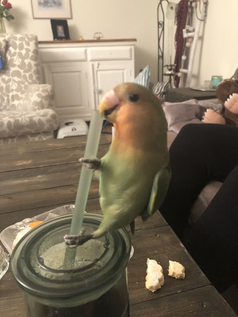 Dvergpapegøye med fargene rød ,grønn og med blått på halen .