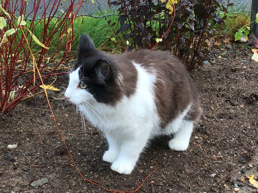 Han er 7 måneder, har hvit mage og sort buskete hale. Veier ca 3,5 kilo.