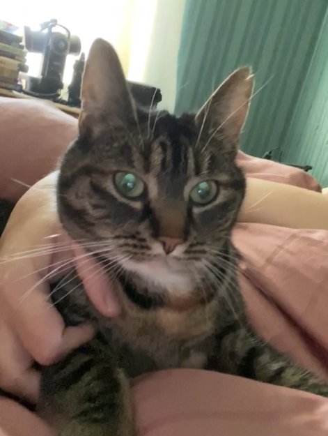 Kastrert hunnkatt, tillitsfull. God og rund når hun forlot oss. «Prater» mye. Har kun bodd en mnd hos oss, dette var 2. gang hun fikk gå ut. Før dette bodde hun i byggefeltet ved bråsteinvannet i retning bogafjell/håbafjell. Hun kan ha lagt på vandring for å komme tilbake til tidligere hjem. Har et hakk i venstre øre.