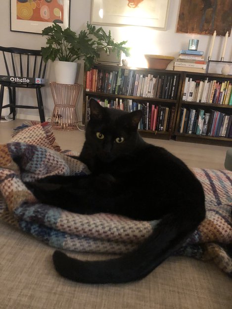 Helt sort, med noen få hvite hår under haken. Sort og rødt halsbånd med mitt tlfnr. Kosete.