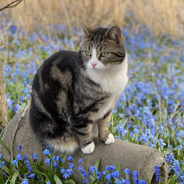 En stor hunnkatt på 5 kg. Hvite poter og hvit hals. Hvit stripe mellom øynene som går ned over nese, munn og hals.